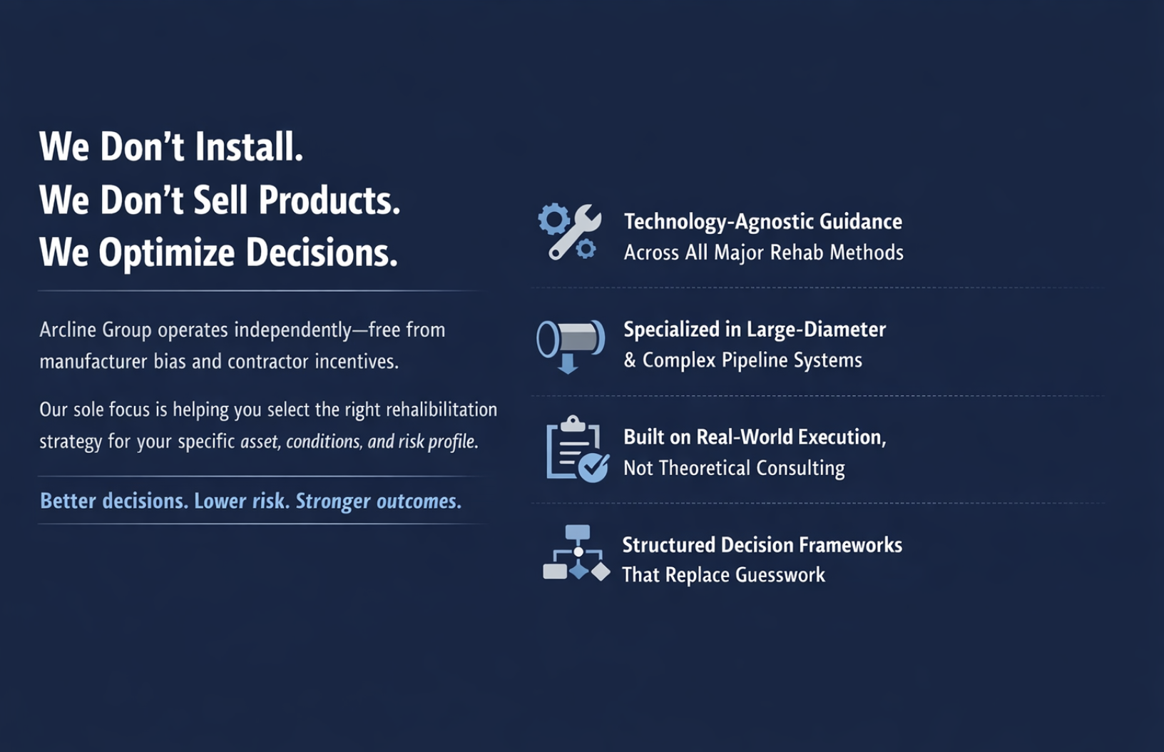 Arcline Group helps utilities, engineers, and contractors select the right rehab strategy—reducing risk, avoiding failure, and maximizing project ROI.